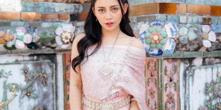 Rachel Vennya tampil memesona dengan busana Chut Thai berwarna pink yang dipadukan dengan hiasan rambut emas. Penampilannya terlihat anggun dan menarik perhatian.