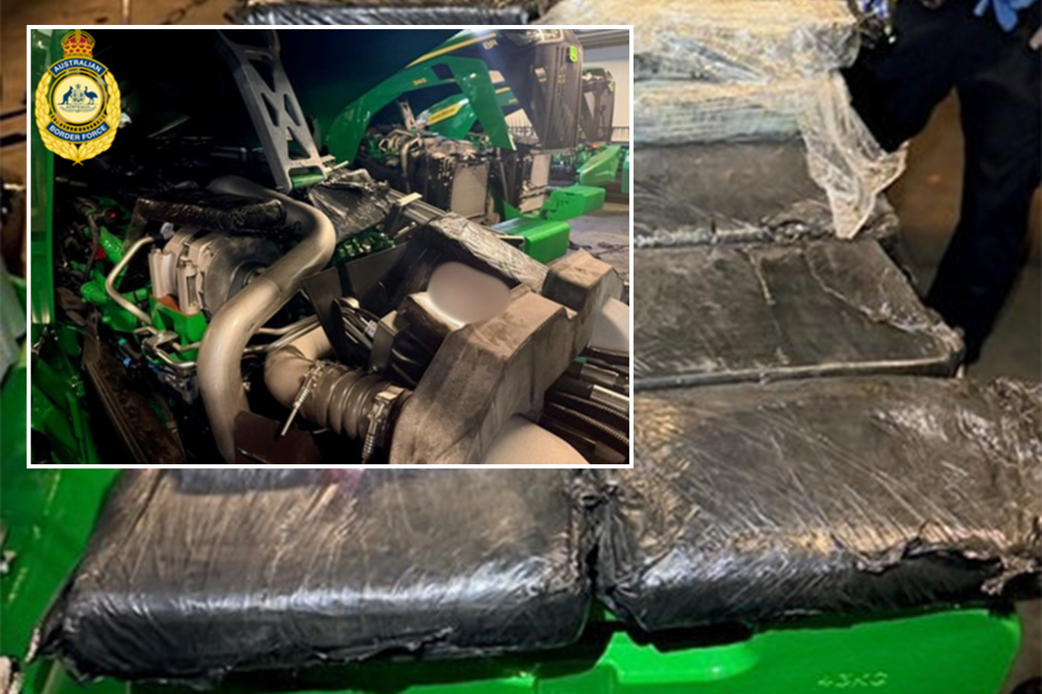 Officers made the first discovery during a targeted inspection in Brisbane on Monday, April 6, locating 19 plastic-wrapped blocks concealed inside a green tractor on a vessel bound for Port Kembla in NSW. Testing returned a presumptive positive result for cocaine, with a total of 22.25kg uncovered. It has an estimated street value of about $7.1 million.