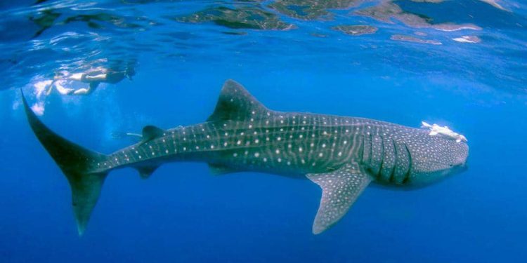 Hiu paus (whale shark). Meskipun ukurannya raksasa, mereka hanya makan plankton dan ikan kecil. Mereka sangat lambat dan sering membiarkan penyelam berenang di dekatnya.