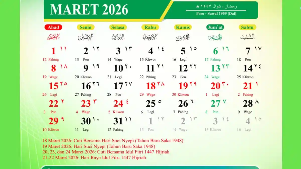 SKB 3 Menteri terbaru menetapkan total 17 hari libur nasional dan 8 hari cuti bersama untuk tahun 2026. Berikut adalah rinciannya, termasuk yang berfokus pada bulan Maret:
