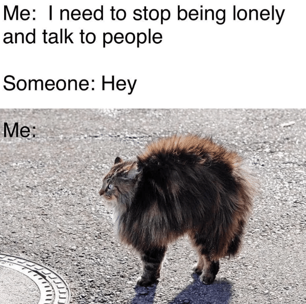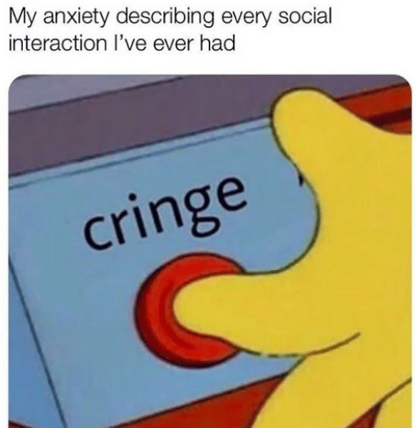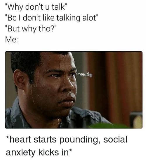 Bagi sebagian orang, berbicara dan melakukan aktivitas sosial terasa sangat mudah. Namun, bagi sebagian lainnya, hal tersebut justru menjadi momen yang menakutkan. Bahkan, beberapa orang merasa cemas dan kelelahan setelah menghadapi interaksi sosial. Berikut ini adalah tujuh meme yang mewakili perasaan para pengalaman cemas saat bersosialisasi.