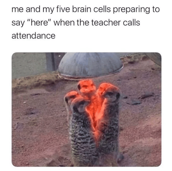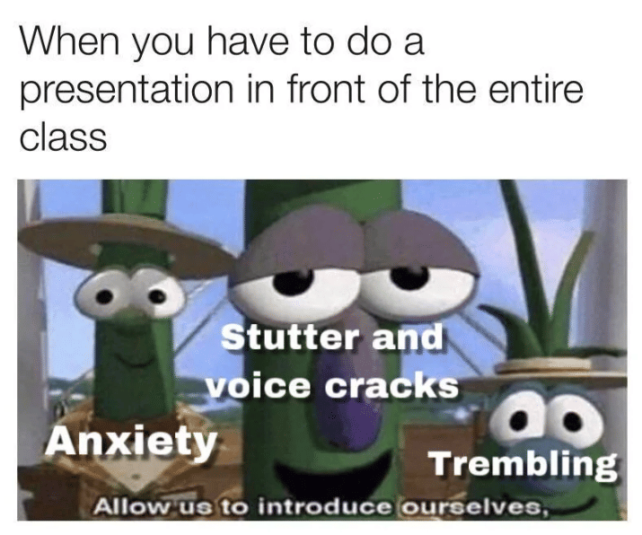 Menjawab pertanyaan guru bisa menjadi momen yang menegangkan. Semakin dekat dengan urutan presensi, semakin tinggi rasa gugup. Meme ini mencerminkan kecemasan yang muncul ketika seseorang harus berbicara di depan kelas.