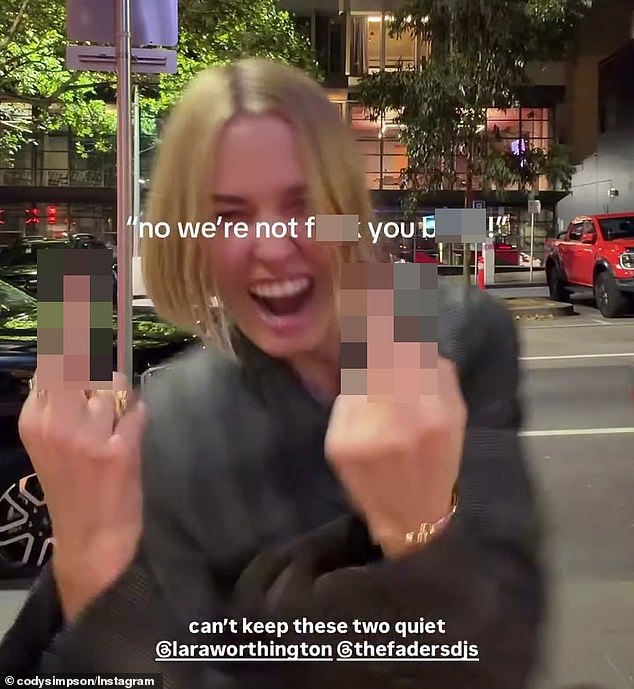 Lara Worthington then takes centre stage, physically nudging Cody along the street while simultaneously raising the middle finger on both hands as she is filmed. Her accompanying caption leaves little room for interpretation, defiantly stating, “No, we’re not, f you bh,” and adding, “Can’t keep these two quiet.”