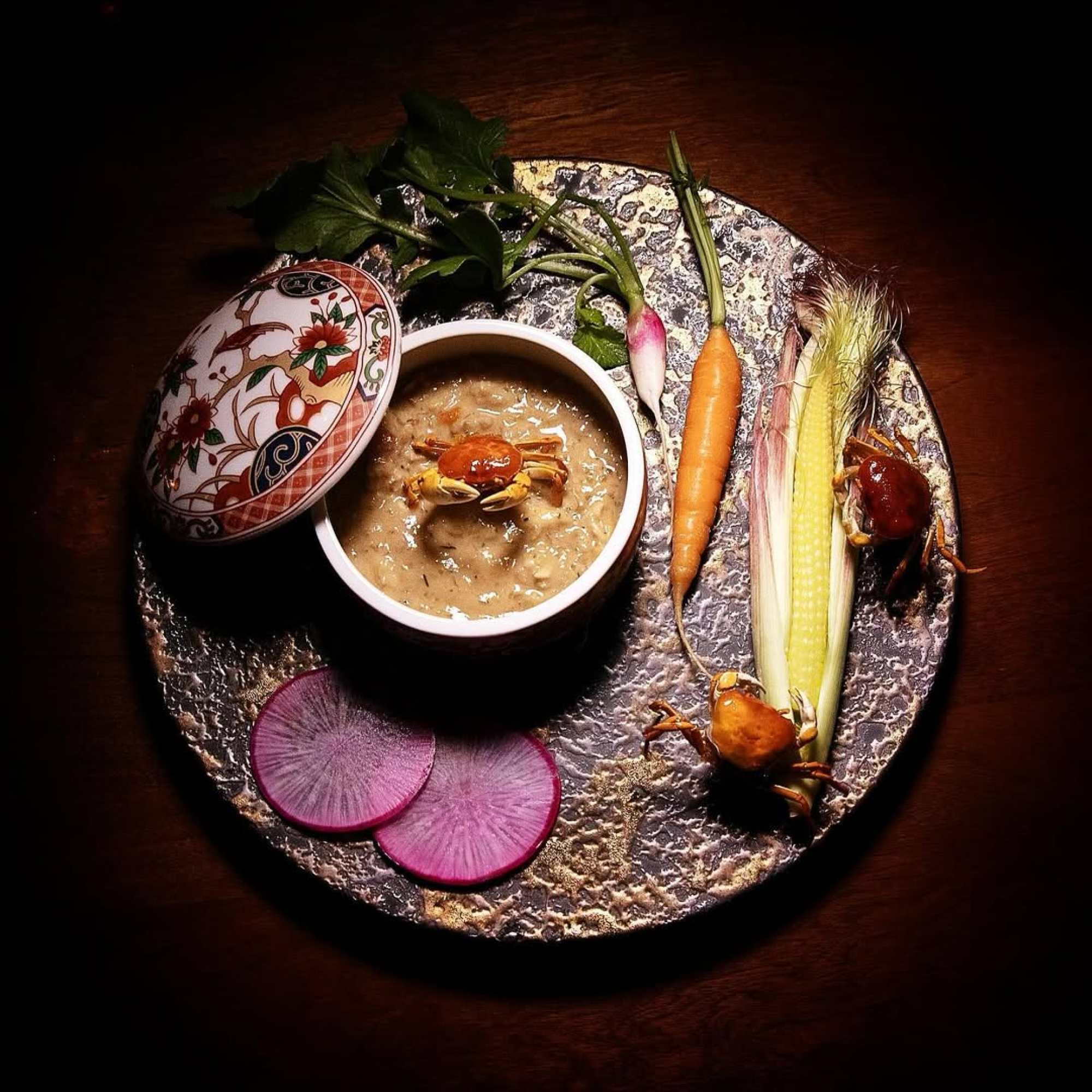 - Mokuzugani: Japanese mitten crab, simply grilled over binchotan charcoal.