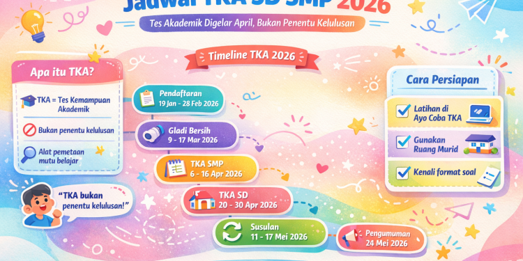 Hasil TKA akan diumumkan pada 26 Mei 2026. Sebelum pengumuman tersebut, terdapat beberapa tahapan penting yang harus dilalui. Pertama, pelaksanaan susulan TKA akan berlangsung pada 11 hingga 19 Mei 2026. Setelah itu, proses pengolahan hasil TKA akan dilakukan antara 20 hingga 24 Mei 2026.