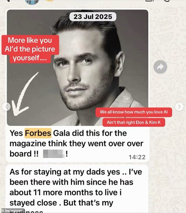 In one of the messages, Lee sent a brooding black and white portrait and wrote: ‘Yes Forbes Gala did this for the magazine think they went over over board!! D**ks!’ Alana responded with a message that questioned Lee’s reliance on AI, referencing his attempts to prove he had worked with Kim Kardashian and Kris Jenner.