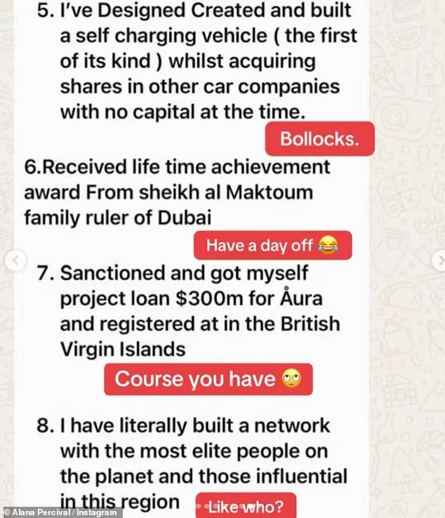 Alana continued to share more screenshots of Lee’s claims, including: ‘I Partnered and sponsored with famous sports teams’, alongside which she wrote: ‘Contacted – you never handed over money.’ Lee responded with: ‘These are All facts and you think I’m jobless Or lying I’ve done nothing but down play and be humble I never wanted anything from you Alana Think your lying? We know your lying…’