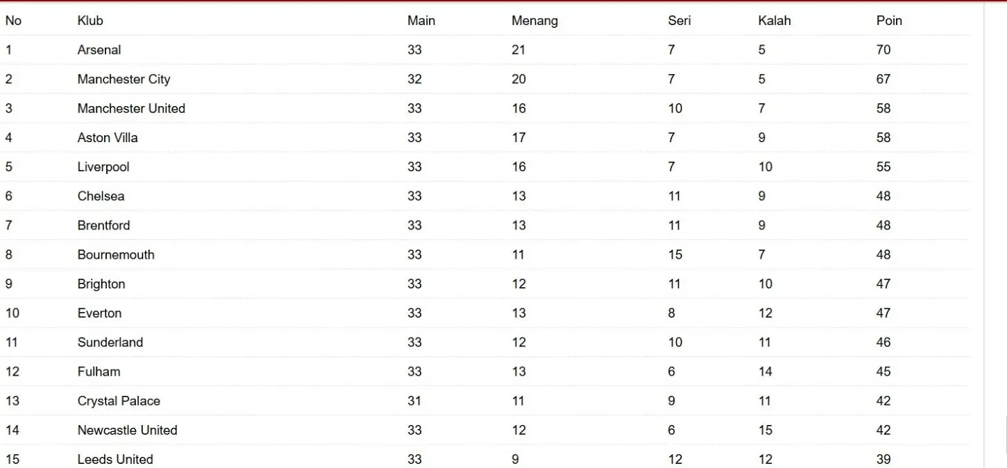 Klasemen Liga Inggris: Arsenal Bertahan di Puncak, Manchester City Menyusut Jarak 3 Poin