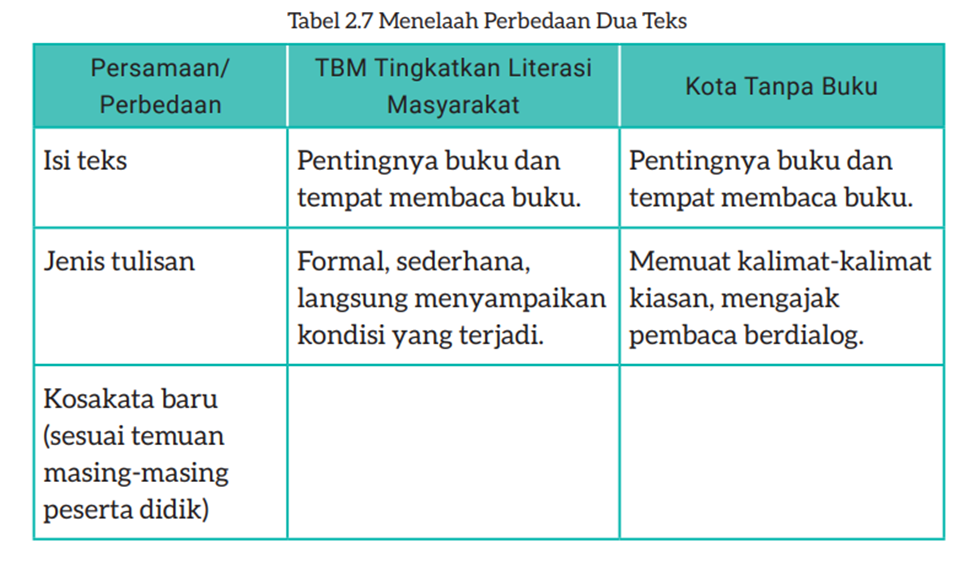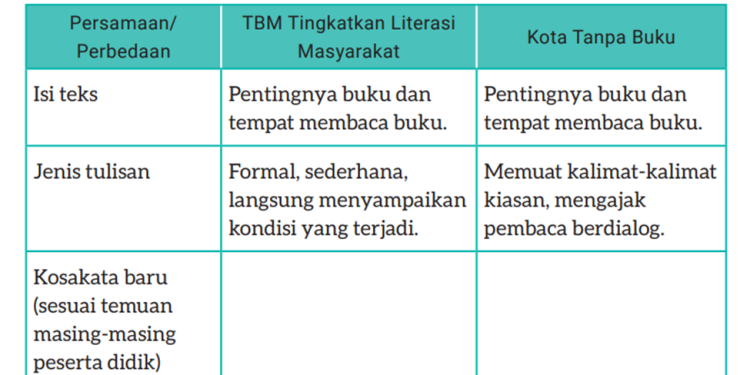 Bandingkan teks “Taman Bacaan Masyarakat (TBM) Tingkatkan Literasi Masyarakat” dan teks “Kota Tanpa Buku”. Dapatkah kalian menemukan persamaan dan perbedaannya?