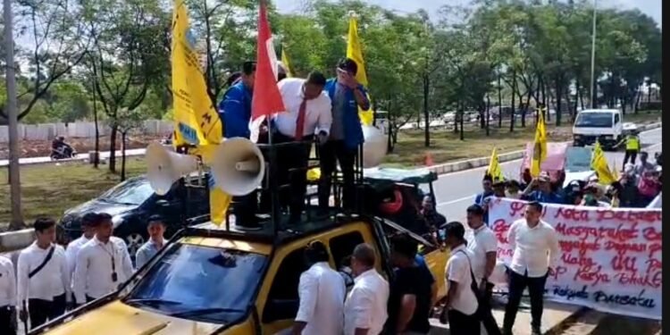 Demo mahasiswa dari kelompok Pergerakan Mahasiswa Islam Indonesia (PMII) Cabang Kota Batam untuk mendesak pihak kepolisian Polresta Barelang mengungkap dugaan penggelapan dana para nasabah Koperasi Simpan Pinjam (KSP) Karya Bhakti yang ditaksir miliaran rupiah berlangsung di depan Kantor Mapolresta Barelang, Senin (20 Maret 2023).