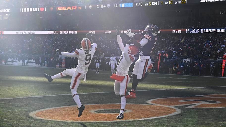 - DJ Moore had to make a spectacular, contested catch, snagging the ball precisely between the outstretched arms of two converging defenders. The window for the pass was incredibly small.