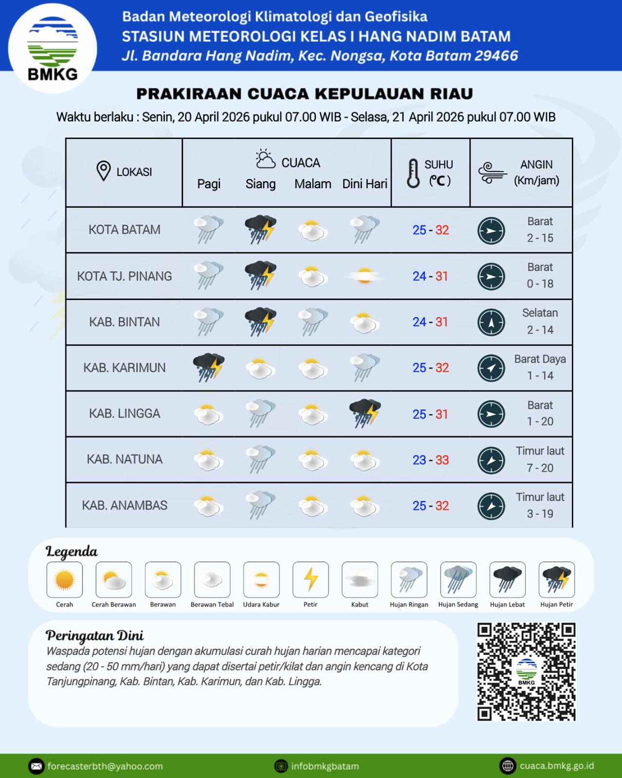 “Secara umum, cuaca di wilayah Kepulauan Riau hari ini diprakirakan berawan dan berpotensi terjadi hujan dengan intensitas ringan hingga sedang pada siang dan dini hari,” ujar Forecaster on duty BMKG Hang Nadim dalam laporan narasi cuaca, Senin (20/4/2026).