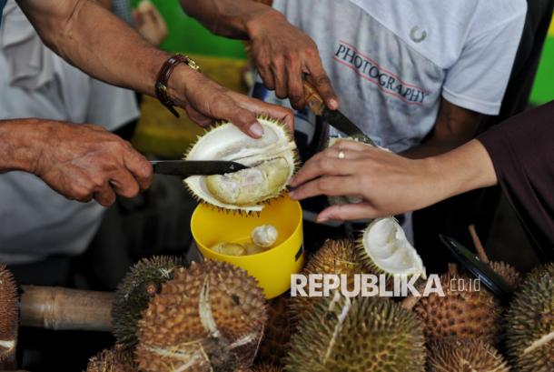 Calon pembeli mencicipi buah durian di lapak dagangan durian Palembang di kawasan Warung Buncit, Jakarta, Ahad (2/1/2025). Durian lokal tersebut didatang dari Palembang saat musim panen untuk di pasarkan di beberapa daerah seperti Jawa, Lampung hingga Jakarta. Harga durian dibanderol mulai dari Rp25 ribu hingga Rp150 ribu tergantung ukuran dan kualitas buah durian. Dalam sehari, Andi (51) pemilik lapak durian, dapat menjual sebanyak 1.000 hingga 1.500 juta perhari dengan omset harian mencapai Rp30 juta. Durian tersebut dipasok langsung dari Palembang, Sumatera Selatan dalam sehari 3 truk. Andi menuturkan, Jakarta menjadi salah satu daerah dengan peminat buah durian yang paling tinggi. – (/Thoudy Badai)