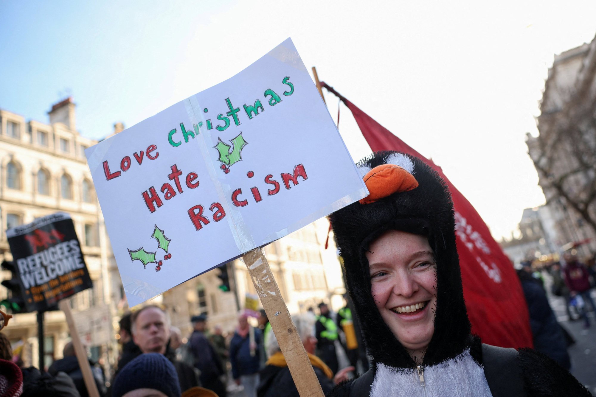 Namun seorang wanita di aksi tandingan memegang plakat bertuliskan: “Kristus adalah pengungsi saat Natal.”
