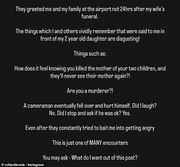 Dennis recounted how the media treated him in the aftermath of the tragedy. He described being greeted at the airport just 24 hours after his wife’s funeral, with reporters making comments that were deeply upsetting, especially in front of his two-year-old daughter.