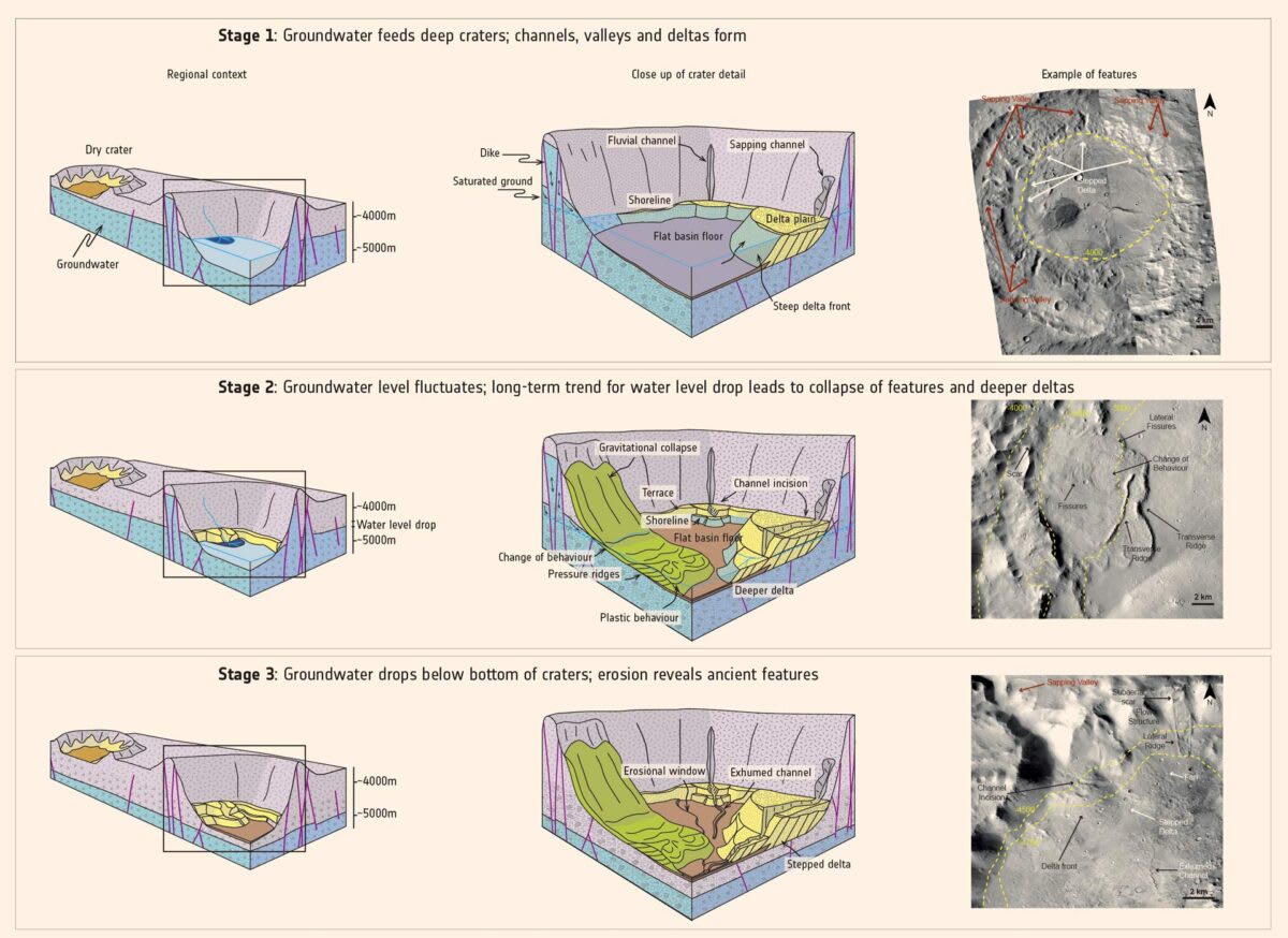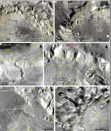 According to the findings, the craters show channels carved into walls, groundwater-formed valleys, delta-like deposits, and terraced structures. Each of these features indicates the sustained presence of water. Many formations occur at similar depths, between 4 and 4.5 km, suggesting a stable water table across multiple sites.