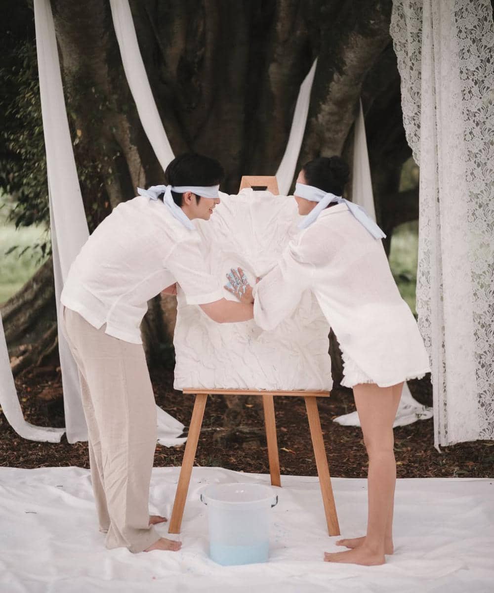 Proses pengungkapan jenis kelamin bayi dilakukan dengan cara yang unik. Keduanya menutup mata masing-masing dengan kain putih, menciptakan suasana penuh antisipasi. Setelah itu, mereka melumuri kedua tangan dengan cat berwarna. Dengan gerakan yang kompak, keduanya mencap kedua telapak tangan mereka di atas sebuah kanvas. Momen ini menjadi saksi bisu dari penantian mereka akan identitas sang calon buah hati.