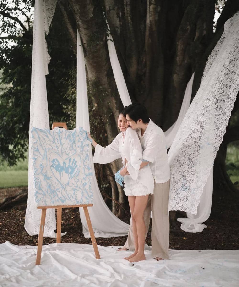 Selain momen gender reveal yang intim, Angga dan Shenina juga memanfaatkan kesempatan ini untuk mengabadikan keindahan kehamilan Shenina melalui sesi maternity shoot. Dengan mengenakan busana serba putih yang memberikan kesan suci dan elegan, keduanya berpose mesra. Shenina dengan bangga memamerkan perutnya yang semakin membesar, sementara tangan Angga terlihat dengan lembut diletakkan di atas baby bump Shenina, menunjukkan kasih sayang dan perlindungan yang mendalam.
