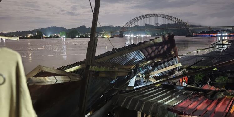 Menurut penuturan Ribut, tongkang tersebut diduga terlepas dari tambatannya sebelum akhirnya menghantam bagian dapur rumahnya yang persis berada di tepi sungai. Benturan keras yang terjadi membuat struktur dapur hancur berantakan. “Semua isi dapur habis. Mesin cuci, kompor, peralatan dapur, piring, tabung gas, semuanya jatuh ke sungai,” tambahnya, menggambarkan betapa parahnya kerugian material yang dialami.