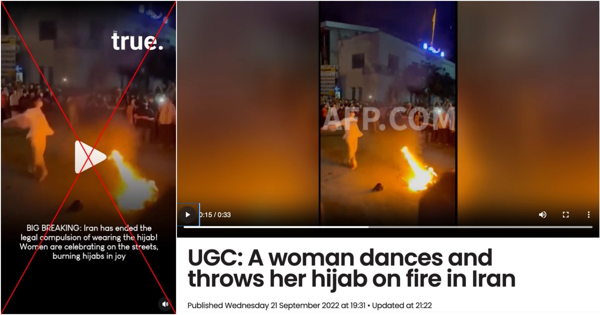 Keterangan yang menyertai video tersebut di media sosial, seperti Instagram, Facebook, dan TikTok, mengklaim bahwa Iran telah menghapus kewajiban hukum untuk mengenakan hijab dan para wanita merayakannya dengan membakar hijab di jalanan. Klaim ini, sayangnya, tidak benar.